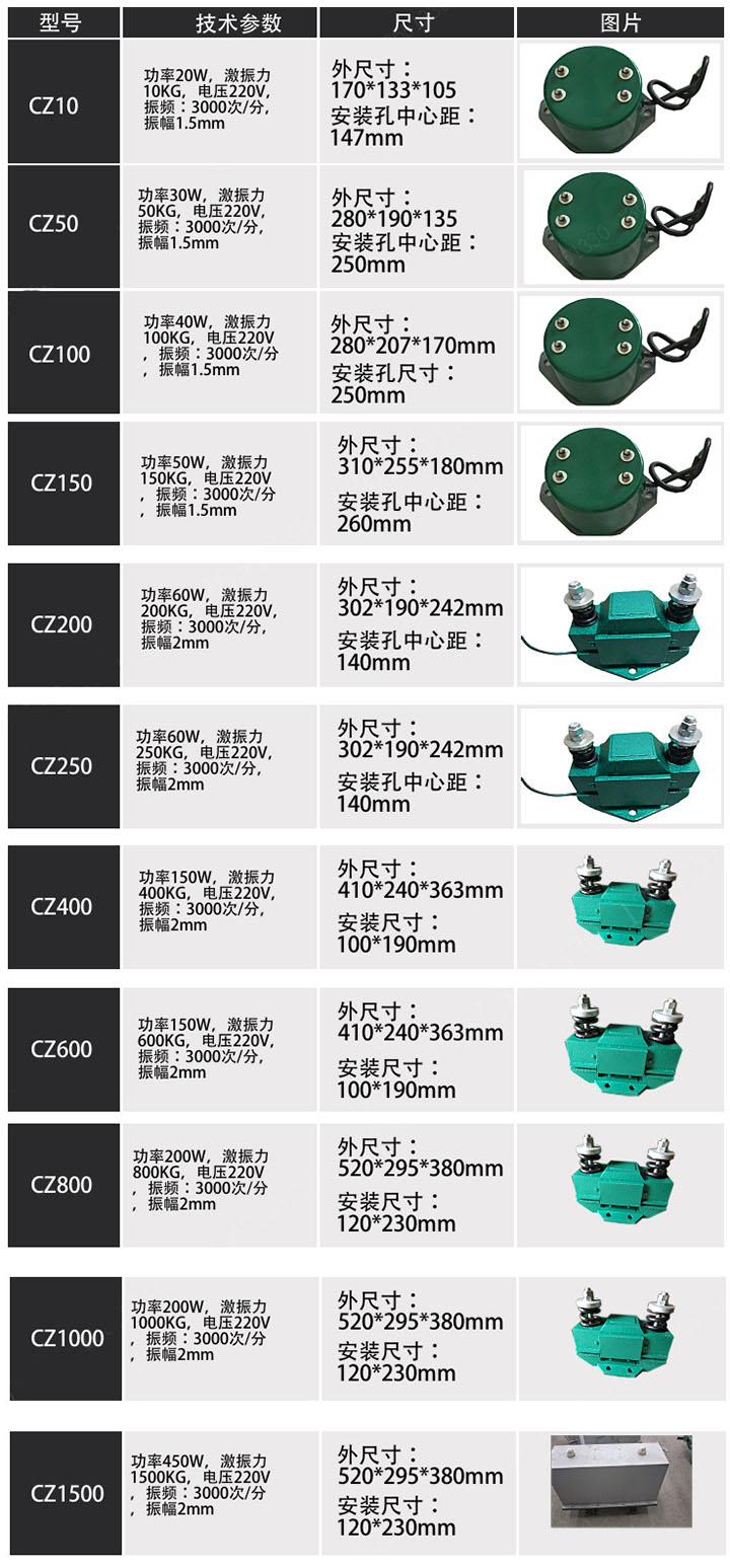 | 振动力(kg) | 10 | 50 | 100 | 250 | 600 | 600 | 1000 |