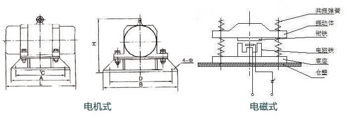 电机仓壁振动器是由振动电机加底座构成,振动电机和底座由螺栓紧密地固定为一体。电磁仓壁振动器由振动体、共振弹簧、电磁铁、机座等组成。