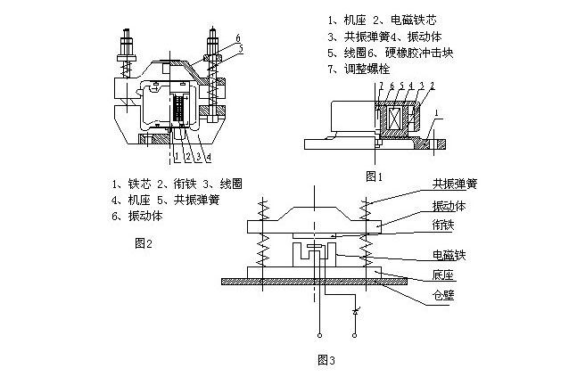 电磁仓壁振动器由振动体、共振弹簧、电磁铁、机座等部件组成。